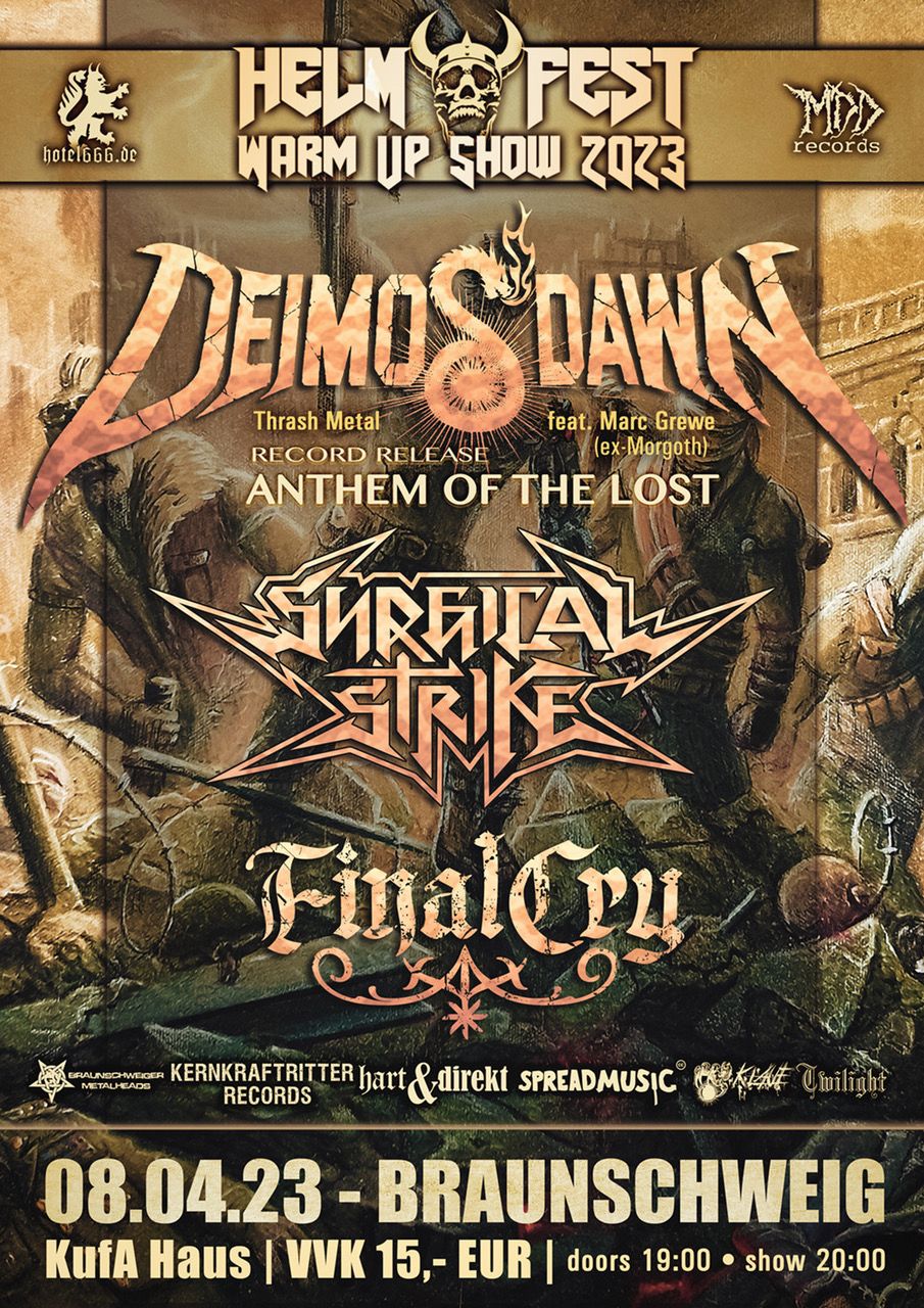 Bestes und aktuellstes Beispiel ist eben jener Marc Grewe (ex-Morgoth, Insidious Disease), seines Zeichens Deutschlands Vorzeige-Growler Nummer Eins und seit Jahrzehnten eine verlässliche Größe im internationalen Death Metal, der mit Deimos´ Dawn erstmals einer Thrash Metal Band reinsten Wassers und klassischer Prägung voransteht.